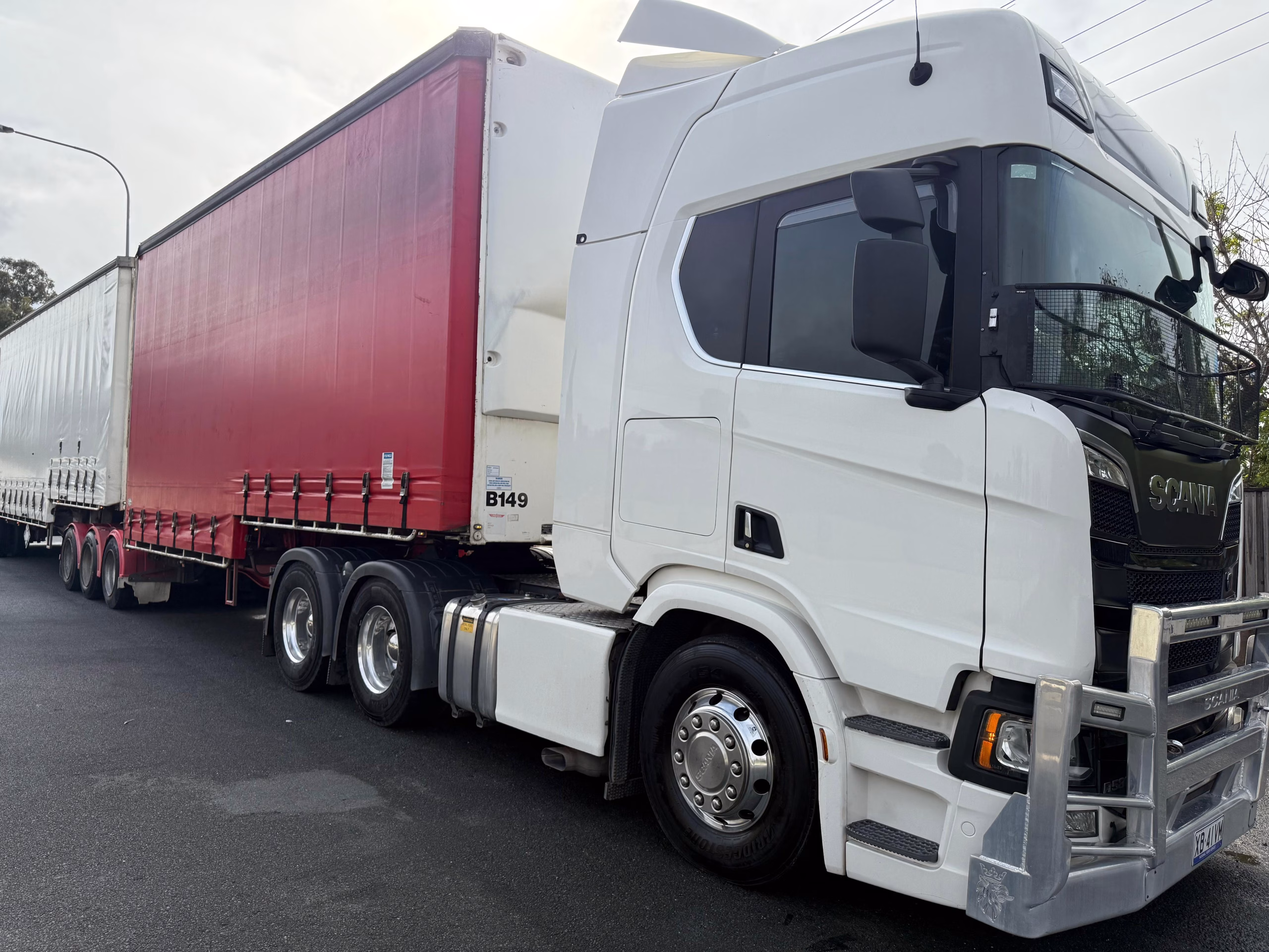 Yuvishan Freights operates a modern Scania Euro 6 prime mover with B-double trailers, delivering linehaul and retail DC freight for major FMCG and retail customers.